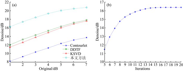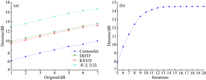 对信噪比为1~7 dB的含噪模拟数据使用contourlet变换、DDTF、KSVD和本文方法去噪,信噪比变化如图 6a所示,图 6b显示的是随着FISTA迭代次数的增加,使用本文方法处理4 dB含噪模拟数据的信噪比变化.