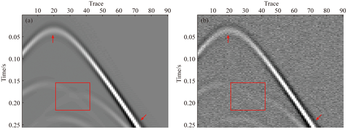 为了研究本文方法的去噪性能,采用的模拟数据如图 2a所示,共有90道,每道采样点为256个,道间距为10 m,时间采样间隔为0.001 s.模拟数据还包含了4个同相轴,其中1个能量较强,3个较弱,红框内为相互交叉的两个能量较弱的同相轴,并用红色箭头标注出能量较强同相轴的顶点和模拟数据中能量最强部分.对模拟数据加入随机噪声,如图 2b所示,信噪比为4 dB,可以从含噪数据中分辨出能量较强的同相轴,识别出红色箭头所指部分,但是能量较弱的同相轴已经模糊不清,红框内无法识别出相互交叉的同相轴.