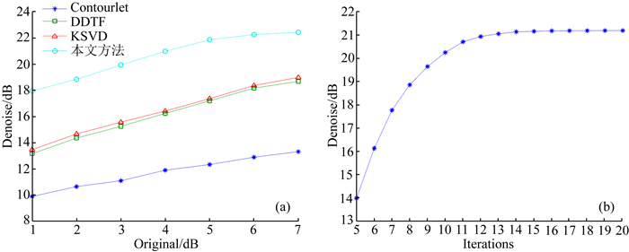 对信噪比为1~7 dB的含噪海洋数据使用contourlet变换、DDTF、KSVD和本文方法去噪,信噪比变化如图 16a所示,图 16b显示的是随着FISTA迭代次数的增加,使用本文方法处理1 dB含噪海洋数据的信噪比变化.
