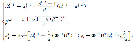 (4) 式中,上角标k表示迭代次数,Ωik-1表示前两次系数的叠加组合,βk-1是初始值为1的参数,α为控制步长的参数,aik为通过FISTA更新的系数,soft为软阈值函数,表示为