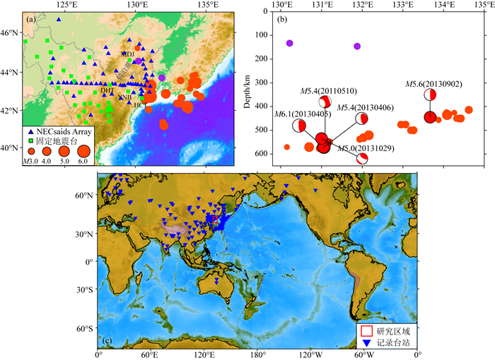 除中国东北深震区周边的珲春台(HCT)、延边台(YNB)、敦化(DHT)和牡丹江台(MDJ)等固定地震台站记录到的高质量深震波形外,2010年7月底至2014年12月期间我们陆续在东北深震区周边布设的由约60个宽频带地震台组成的NECsaids流动地震台阵(图 1a中蓝色三角形;Wang et al., 2016),在观测期间也记录到了信噪比较高、质量良好的深源地震波形数据,这些数据为深震前后的小震活动的检测提供了良好基础.