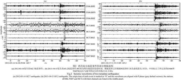 图 2 两次较小地震事件的部分模板波形 (a)2012-03-14发生的M2.7地震事件;(b)2013-10-15发生的M3.2地震事件.0时刻为两次地震的发震时刻,模板波形已经根据P波到时(灰色虚线箭头)对齐,中间标示了所记录的ENO6和NS07流动台与HCT固定台的名称(台站.分量). Fig. 2 Seismic waveforms of two template earthquakes (a)2012-03-14 M2.7 earthquake; (b)2013-10-15 M3.2 earthquake. The origin time of each event is marked as "0" and the waveforms are aligned with P phase(gray dashed vectors), the stations (EN06, NSO7 and HCT)with their channels are listed in the middle panel. |