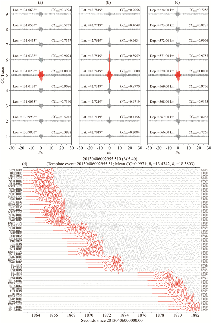 图 5 M&L对2013-04-05地震事件的互相关叠加波形及波形对比图 模板事件为2013-04-06发生的地震. (a)纬度和深度保持不变,经度在130.9833°E—131.0633°E的范围内变化;(b)经度和深度保持不变,纬度在42.7019°N—42.7819°N的范围内变化;(c)经度和纬度保持不变,深度在566~574 km的范围内变化.红色波形事件范围为-3~3 s,左侧标出各变量大小,右侧标出自相关叠加波形的最大值;(d)红色波形表示2013-04-06事件模板波形,灰色波形为待检测连续波形(2013-04-05),图上方给出了检测的相关系数和信噪比,下方为波形起始时刻,左侧表示台站名称,右侧表示相关系数. Fig. 5 Stacked CC and comparison between template and continuous waveforms in M&L detection The 2013-04-06 M5.4 earthquake is selected as template event. (a) The latitude and depth are fixed, and the longitude varies within 130.9833°E—131.0633°E; (b) The longitude and depth are fixed and the latitude varies within 42.7019°N—42.7819°N; (c) The latitude and longitude are fixed and the depth varies within 566~574 km; (d) The red and gray curves are template and continuous waveforms, respectively. |