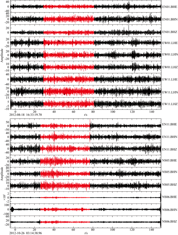 表 1中所列的2012年8月18日和2012年10月26日两次M3.2中源地震(震源深度分别为146 km和133 km)未能被用于M&L自检测,原因是我们仔细检查这两次事件发生时段前后的波形时,发现流动台和固定台站均未能记录到明显的地震波形(如图 4中红色部分波形),也即没有可用的模板波形,并且我们在ISC网站(http://www.isc.ac.uk)搜索这两次地震事件的震相记录,发现只有位于奥地利的全面禁止核试验条约组织(CTBTO)的国际数据中心(IDC,International Data Centre,http://www.ctbto.org/)给出了这两次事件相关的数据,而距离震源更近的中国地震台网中心(CENC)和其他机构都没有给出这两次事件的任何信息.