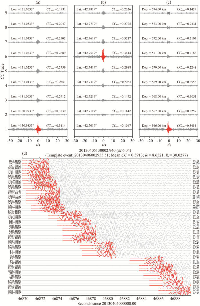 图 3 M&L对2013-04-06地震事件的自相关叠加波形及波形对比图 (a)纬度和深度保持不变,经度在130.9833°E—131.0633°E的范围内变化;(b)经度和深度保持不变,纬度在42.7019°N—42.7819°N的范围内变化;(c)经度和纬度保持不变,深度在566~574 km的范围内变化.红色波形事件范围为-3~3 s,左侧标出各变量大小,右侧标出自相关叠加波形的最大值; (d)红色波形表示模板波形,灰色波形为待检测连续波形.图上方给出了检测的相关系数和信噪比,下方为波形起始时刻,左侧表示台站名称,右侧表示相关系数. Fig. 3 Stacked CC and comparison between template and continuous waveforms in self-detection of the earthquake on 2013-04-06 (a) The latitude and depth are fixed, and the longitude varies within 130.9833°E—131.0633°E; (b) The longitude and depth are fixed and the latitude varies within 42.7019°N—42.7819°N; (c) The latitude and longitude are fixed and the depth varies within 566~574 km; (d) The red and gray curves are template and continuous waveforms, respectively. The Max. CC and SNR are listed in the header, name of template waveform and corresponding CC are listed in the left and right. |