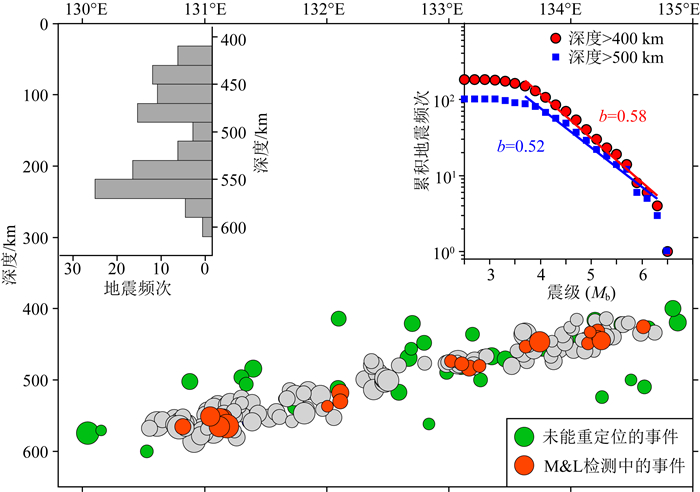 高温高压实验和地球物理观测研究表明,深源地震的发生与板块深俯冲活动及其相伴生的体系密切相关(Wiens et al., 1994; 干微等, 2012; Houston, 2015),但有关深源地震的成因机制依然存在着争论(Romanowicz, 2018),目前争论较多的深源地震可能的成因机制主要有三种(参见Frohlich, 2006; Houston, 2015; Li et al., 2018):脱水脆裂(Dehydration Embrittlement)、橄榄石相变引起的反裂隙断层或相变断层作用(Anticrack/Transformational Faulting in a Metastable Phase)以及热剪切失稳作用(Thermal Shear Instability).由于深源地震的孕震环境、破裂过程极其复杂并且可能是动态变化的,因此不同震源深度、不同地区的深源地震发震机制也可能是不同的.近年来对震级较大的深源地震(MW>6.5)的破裂过程研究表明(Kanamori et al., 1998; Bezada and Humphreys, 2012; Wei et al., 2013; Ye et al., 2013, 2016a; Zhan et al., 2014; Chen and Wen, 2015; Zhan, 2017),一次震级较大的深源地震可以分为若干次子地震事件(sub-event)破裂,首先在温度较低的位于俯冲板片的MOW成核并开始破裂,由于破裂能量大、速度快,破裂可能会突破MOW以热剪切熔融或热逃逸的方式向外传播,进而激发子事件或余震事件.Zhan(2017)针对不同俯冲区、不同震级范围的深源地震b值的差异,提出了深源地震的“双机制”假设:深源地震在MOW内部只以相变断层作用方式成核并开始破裂,但若破裂突破MOW后就以热剪切熔融或热逃逸的形式向外传播;上述MW>6.5深源地震的破裂过程可用“双机制”假设进行解释.Jiang和Zhao(2011)、Jiang等(2015)分别利用发生在日本俯冲带的78次和17次深源地震高精度的震源位置及高质量的震相走时数据得到的深震震源区P波波速表明MOW确实存在于日本海及中国东北地区下方的俯冲板片内,MOW厚度自约450 km深度处的50 km逐渐减薄至约580 km深度处的几km,并且深震都发生在MOW内.我们的定位结果(图 7)也表明大多数的深震都发生于Jiang等(2015)给出的MOW内或周边区域.此外,Li等(2018)的研究也表明仅靠相变作用无法完全解释深震震源区的各向异性,俯冲板片中的菱镁矿或碳酸盐岩熔融也可能会引起深源地震的发生.上述这些观测研究为Zhan(2017)的深震“双机制”假设提供了很好的依据.