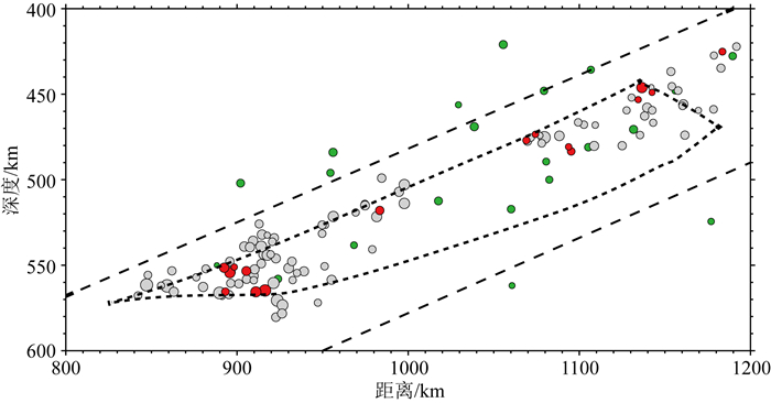 深震与浅震最明显的区别是,深震的余震数量很少(Frohlich, 1987; Wiens and Gilbert, 1996),在相同的地震震级情况下,深震的余震数量比浅震的要少1个数量级或更多(Wiens et al., 1997).此外,不同深源地震区的地震余震活动量是不同的,统计分析表明显著的深震余震活动只出现在较冷的俯冲带(Wiens and Gilbert, 1996),如汤加和马里亚纳深源地震区(Wiens and Gilbert, 1996; Wu and Chen, 1999),而在一些相对较热的俯冲板片如南美的玻利维亚深震区及日本俯冲带的深源地震余震很少甚至基本没有余震活动(Wiens and Gilbert, 1996; 段永红, 2005).但是,也有研究(Wiens et al., 1997)认为深源地震的余震很少甚至基本没有也有可能是由于台站分布稀少造成的漏检.准确的震源位置是探讨地震发生机理的基本前提,Wiens等(1993)通过深源地震重定位发现汤加俯冲带下方350~460 km深度范围内的“双震带”,Iidaka和Furukawa(1994)利用重定位后的深震震源也发现在日本伊豆—小笠原地区300~400 km深度范围内存在“双震带”,这些研究为相变断层作用(Transformational Faulting)作为深源地震可能的成因机制之一提供了重要科学依据.