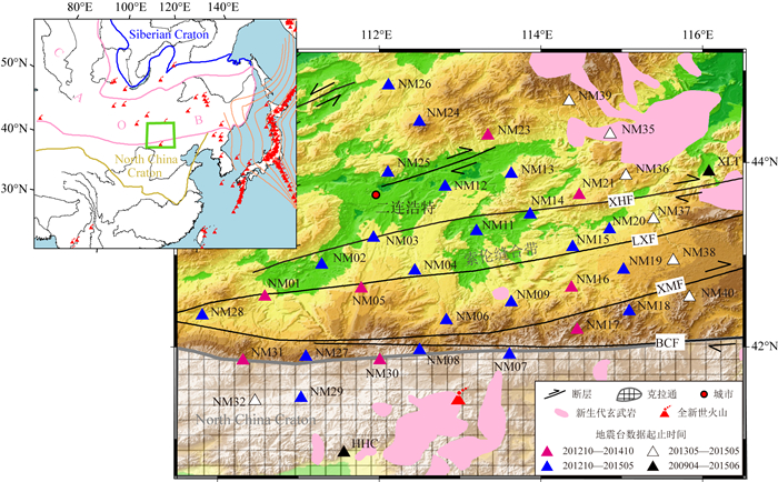 图 1 台站分布及研究区构造图 三角形表示地震台位置,其中不同颜色代表不同的数据起止时间.粉色不规则区域为新生代玄武岩(Guo et al., 2016),黑色实线为走滑断层(据Xiao et al., 2003; Xu et al., 2013),其中XHF为锡林浩特断层,LXF为林西断层,XMF为西拉木伦断层,BCF为巴彦敖包—赤峰断裂.左上角插图为研究区(绿色实线框)在大比例尺地图中的位置,其中CAOB为中亚造山带. Fig. 1 Location of the seismic stations involved in this study Colored triangles indicate the position of seismic stations for different observation periods. Active faults are represented by black solid lines (from Xiao et al., 2003; Xu et al., 2013) and pink area denotes the distribution of the Cenozoic basalts (Guo et al., 2016). Top left shows the study area on a large scale, in which the green solid rectangle outlines the study area. Abbreviations on the map are as follows: XHF, Xilinhot Fault; LXF, Linxi Fault; XMF, Xilamulun Fault; BCF, Bayan Obo-Chifeng Fault; CAOB, Central Asian Orogenic Belt. |