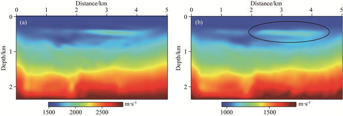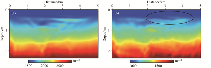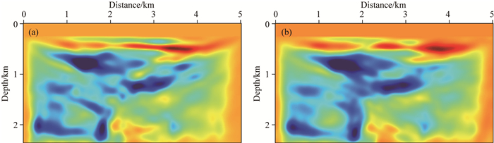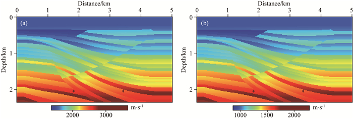 图 7 常规走时反射波反演结果 (a)纵波速度; (b)横波速度. Fig. 7 Conventional reflection travel-time inversion results (a) Compressional wave; (b) Shear wave. |