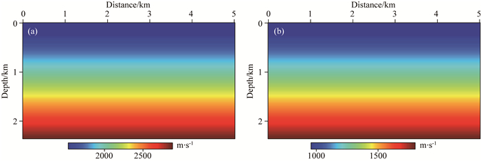 图 4 线性初始速度模型:(a)纵波速度; (b)横波速度 Fig. 4 Linear initial velocity models: (a) Compressional wave; (b) Shear wave |