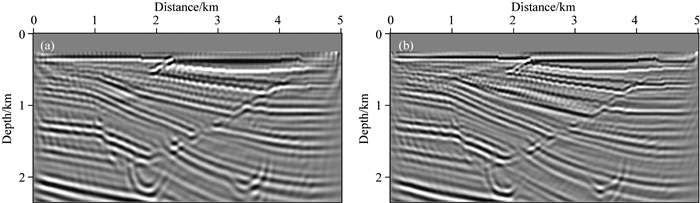 其中Mod表示P波模式或S波模式.梯度式(18)的显示表达式同样可以根据伴随状态法以及方程(3)直接给出.图 1和图 2分别展示了非解耦(常规)与解耦情况下纵横波速度的梯度敏感核算子.由于多分量地震数据中纵波能量要比横波能量强很多,因此解耦与否对纵波速度的梯度敏感性影响不大(图 1a和图 2a).就横波速度而言,由于其对弹性波场的敏感性要弱于纵波速度,因此横波速度反演(梯度算子)更容易受到其他波型的影响从而导致反演精度下降.从图 1b和图 2b可以看出,解耦梯度算子在很大程度上提高了横波梯度算子分辨率.