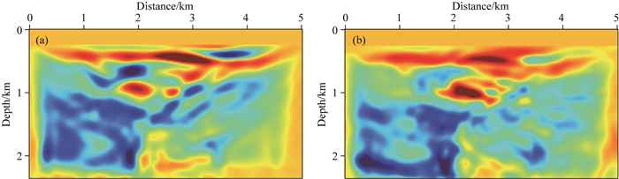 图 9 解耦反射波走时反演第10次迭代梯度结果 (a)纵波速度; (b)横波速度. Fig. 9 The 10th gradients using decoupling reflection travel-time inversion for models (a) Compressional wave; (b) Shear wave. |