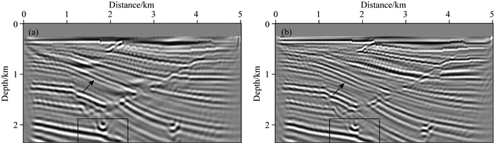 图 8和图 11分别对应利用图 7和图 10所示速度场进行偏移获取的纵、横波阻抗扰动剖面.可以看出,相比于线性初始模型偏移结果,图 8和图 11中偏移剖面收敛程度得到了显著提高,尤其是模型下方的绕射点均得到了很好的收敛.然而进一步比较图 8和图 11可以看出,图 11中的断陷区域(黑色箭头处)以及底层高速区域(黑色框区域)的成像结果分辨率更高.从侧面也证实了解耦方程反射波反演结果要优于常规反射波反演.