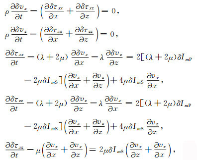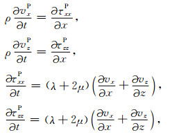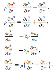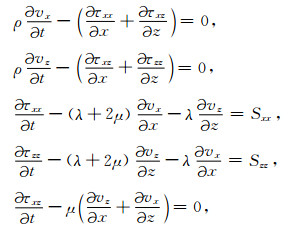 其中vx和vz分别代表质点速度的水平分量和垂直分量,τxx、τzz和τxz为应力,Sxx和Szz表示加载在正应力上的爆炸震源.λ和μ为拉梅常数,ρ为密度.