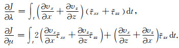 就任意目标函数而言,它们对模型参数的导数(梯度)最终均可以推导为雅克比矩阵与伴随波场乘积的形式,根据伴随状态法(Plessix, 2006)弹性参数λ和μ的梯度计算公式最终可以表示为正传波场与反传伴随波场的互相关(Wang et al., 2012):