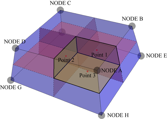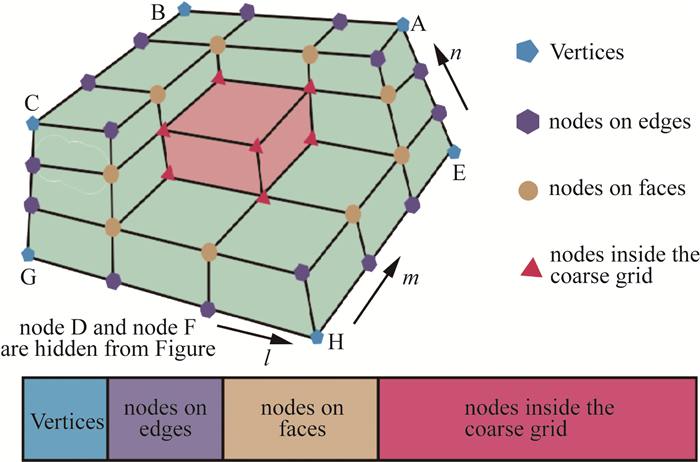 图 3 分割数为3的六面体双重网格 细网格的网格格点坐标可以由粗网格的格点坐标与拓扑关系得到,从而减少了几何描述所需要的大小.根据细网格格点的接触关系,每一个粗网格内包含角点、边点、面点和内点. Fig. 3 A double-mesh hexahedron grid with the division number of 3 The coordinates of the refined grid nodes can be derived from the geometry of the coarse grid, so that the requirement of storage consuming of geometrical file is reduced. According to the contiguous relationship between the grid node and coarse grid, there are 4 types of grid noes, including vertices, nodes on edges, nodes on faces and nodes inside the coarse grid inside each coarse grid. |