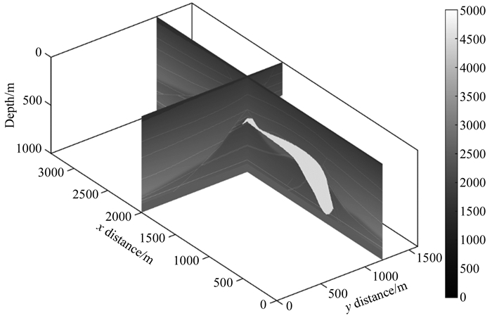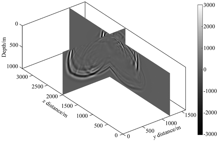 3.3 SEG/EAGE C3模型C3模型是SEG/EAGE于1996年提出的三维盐丘模型,我们使用该模型的部分模型来论证方法能够处理复杂三维介质.模型大小为3.3 km×1.6 km×1 km, 模型的速度如图 10所示,震源为主频20 Hz的雷克子波,时间步长为1 ms,并于在该模型的6个表面加入了40 m的吸收层,吸收边界使用的是非分裂卷积完美匹配层吸收边界条件(Komatitsch and Martin, 2007).