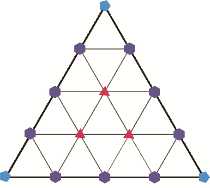 图 2 分割数为4的三角形双重网格 可以看到一个三角形网格被分为了16个全等的三角形细网格. Fig. 2 A double-mesh triangular grid with division number of 4 As can be seen that a coarse triangular grid is divided into 16 congruent refined triangular grids. |