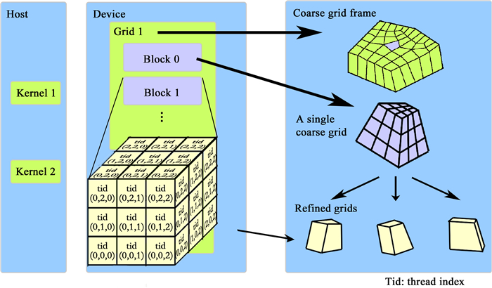 图 4 双重网格格子法GPU配置图 CUDA编程架构的grid, block, thread分别对应于双重网格的网格、粗网格和细网格.该配置充分利用了共享内存,利于实现粗粒度的GPU加速. Fig. 4 A configuration map of the double-mesh grid method The grid, block and thread in the CUDA programming architecture correspond to the grid frame, coarse grid and refined grid. This configuration utilizes the shared memory, facilitating a coarse-grain GPU acceleration. |
