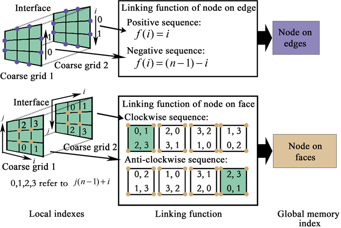 在非结构网格当中,每个网格周围网格单元数不固定.在双重网格结构下,内点仅仅属于一个粗网格内部,所以他们的顺序可以仅由该粗网格的局部顺序决定.而边点和面点与其他粗网格的边点和面点相连,而它们在不同的粗网格局部顺序缺少一个结构化特征来保持一致.所以这两种格点(边点和面点)需要一个不依赖于网格单元的方式来确定,我们使用几何描述文件来唯一确定边点和面点的排列顺序,并通过模板将每个粗网格内的局部编号来转换为他们内存中的排列顺序.在双重网格格子法当中,每条边,每个面都有其唯一编号,并且它们分别存储了该边(该面)的点和边的信息.图 5展示了边点和面点的序号模板.