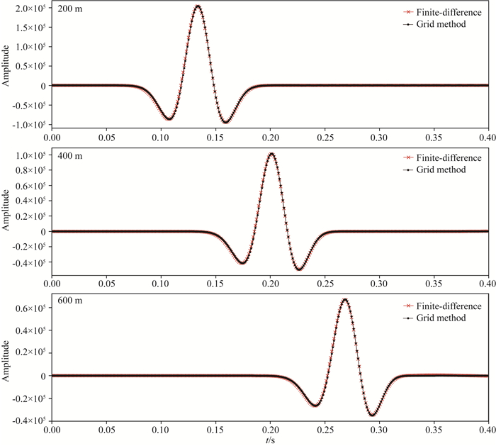 3.1 均匀模型第一个模型为均匀模型,模型大小为2 km×2 km×2 km,速度大小为3000 m·s-1,密度为1200 kg·m-3,细网格尺寸为10 m,时间步长为1.5 ms,震源为主频为15 Hz的雷克子波,模拟时间步长为500步(0.75 s),使用的GPU为Nvidia GTX 980Ti.震源位置位于模型的中心处,我们分别记录了距离震源200 m,400 m和600 m位置处的波形,波形图如图 6所示.从图 6中可以看出,该方法在10 m,1.5 ms网格间距和时间步长的情况下没有出现失稳的情况,并且几乎没有数值频散,说明该方法的稳定性.