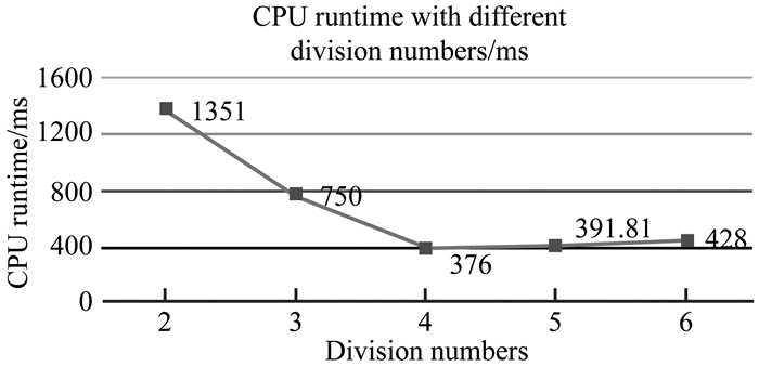 从图 7中可以看出在分割数为2的时候,每个CUDA block下的CUDA thread数量较小,并行度不够,计算时间为1351 ms.可以见到在分割数为3时,粗网格数量明显减少,并且计算时间从1351 ms降低到750 ms.在分割数为4时,即每个粗网格分割为64个细网格.根据CUDA架构,每次有32个运算单元(warp数)计算CUDA thread任务,分割数为4时刚好为32的2倍,即保证了GPU运算单元随时保持满载,进一步提升了计算效率.在分割数大于4的情况下,计算已经成为了该算法的主要瓶颈,计算性能不能进一步提升,并且warp数的非对齐会导致GPU的CUDA核不能保证时刻满载.在分割数为5和6时,计算时间分别为391.81和428 ms.当分割数大于6时,受到GPU寄存器的限制,程序无法正常运行.我们可以得到,一个分割数为4的双重网格配置可以达到计算效率的最大化.