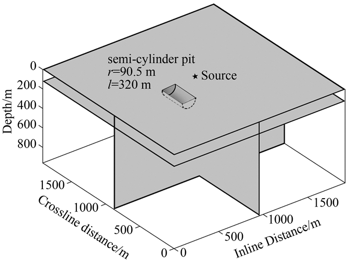 图 8 起伏地表模型 该模型在地表有一个起伏的半圆柱形的坑,圆半径为90.5 m,长度为320 m,震源位置位于地表中心处. Fig. 8 Topographic model There is a semi-cylindrical pit on the surface with the radius of 90.5 m and length of 320 m. The source is located at the center of the surface. |