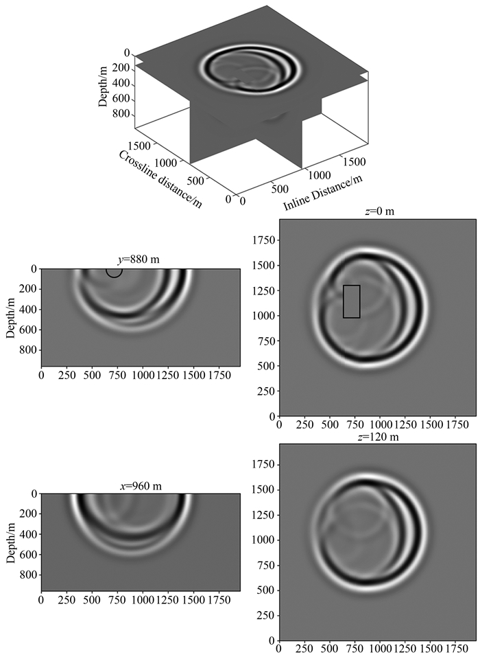 3.2 起伏地表模型第二个模型为起伏地表模型,我们在地表放置了一个半圆形柱的槽,并将震源放置在了地表的中心位置来验证该方法能够处理起伏地表.模型如图 8所示,模型大小为(1960 m, 1960 m, 960 m),速度为3600 m·s-1,密度为1242 kg·m-3,震源位置位于(960 m, 960 m, 0 m),震源类型为主频为20 Hz的雷克子波,速度为圆柱的圆半径为90.5 m,长度为320 m.我们抽取了4个平面,x=960 m, y=880 m, z=0 m, z=120 m,并展示了这4个切面在0.2 s时刻的波场快照,如图 9所示.