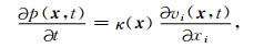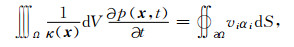 其中,κ(x)=ρv2为体涨模量,ρ为密度,v代表速度,b(x)=1/ρ(x)为浮力模量,vi(x, t)分别为xi方向分量的速度场,p(x, t)为声压场,在式中,i=1, 2, 3为爱因斯坦求和哑标.