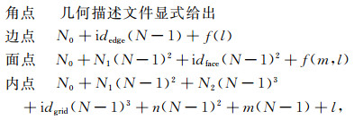 其中,N为分割数,l, m, n为细网格在粗网格的相对位置值,N0, N1, N2分别为角点,边点和面点的个数,f(l), f(m(N-1)+l)为边点和面点序号的模板.