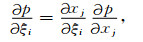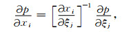 其中p为待求导的参量(声压),xi为笛卡尔坐标系坐标,ξi为等参坐标,i, j=1, 2, 3,等式右手边第一项