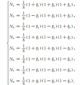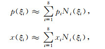 其中,pi, xi(i=1, 2, …, 8)分别为8个格点的声压值和坐标值,Ni为等参变换的形函数,形函数为ξi的函数,表示如下: