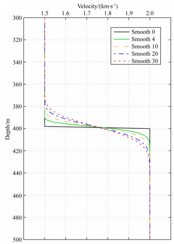 为了分析速度光滑对反射信号到时、主频与能量的影响,本小节以单界面为例进行计算对比.如图 4所示,单界面距源点(或接收点)的深度为400 m,其上层均匀介质速度为1500 m·s-1,下层均匀介质速度为2000 m·s-1,对速度剖面按照深度2 m的网格间距采样,并分别进行不同次数的3点光滑.假设震源子波为Ricker子波,其时间域表达及谱密度函数分别为(俞寿朋,1996)