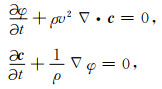 其中,φ为波场(压力场,不区分压力和压强的概念),c为质点振动速度矢量,ρ和v分别为介质的密度与速度,▽·和▽分别为散度与梯度算子.