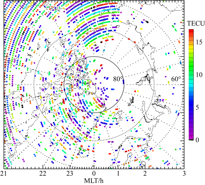 图 1 Madrigal数据库提供的北半球2012年1月1日00:02—00:07UTGPS/TEC观测在MLT/MLAT坐标系下的典型覆盖(色标表示TEC大小) Fig. 1 The classical coverage of polar GPS TEC in MLT/MLAT coordinate system in northern hemisphere with 5 min resolution (from 00:02UT to 00:07UT on 1 Jan, 2012) provided by Madrigal database (The color denotes TEC magnitude) |
