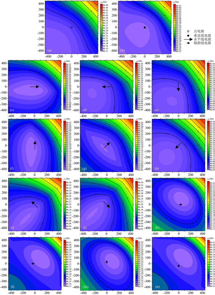 图 4 不同电流源下的地表视电阻率响应.(a)为点源,(b)为垂直线源,(c)—(j)为水平线源,(k)—(n)为倾斜线源,黑色箭头指示线源布设方式 Fig. 4 Surface apparent resistivity response under different current sources. (a) is the point source, (b) is the vertical line source, (c)—(j) is the horizontal line source, (k)—(n) is the inclined line source, and the black arrow indicates the line source layout mode |