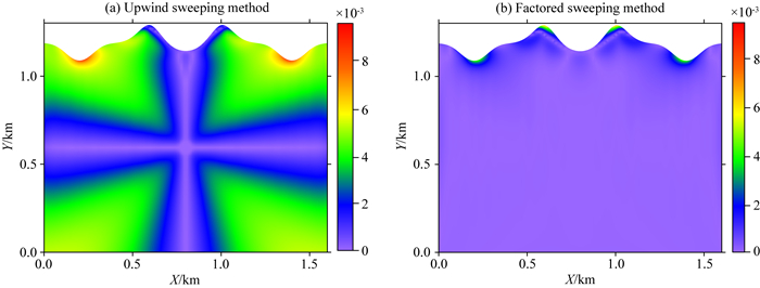 图 15 模型3的走时误差图 (a)迎风扫描法; (b)因式分解法.网格密度为160×120,震源位于(0.8 km, 0.6 km). Fig. 15 Absolute errors of traveltime calculated by (a) upwind sweeping method and (b) factored sweeping method, respectively, on the 160×120 mesh for Model 3 |
