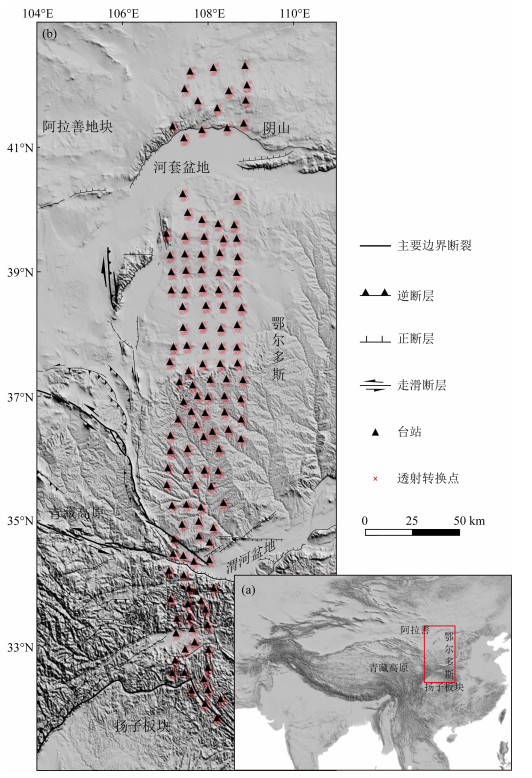 近年来,前人对鄂尔多斯地块及其周缘进行了大量地球物理研究,取得了对该区域深部结构认识的众多重要成果.深地震测深研究认为鄂尔多斯地壳结构简单,壳体内部不发育低速层,平均波速较高(Teng et al., 2013;Jia et al., 2014;张先康等,2003;李英康等,2014);地震体波层析成像研究认为鄂尔多斯地壳上地幔速度结构具有明显的横向不均一性(许忠淮等,2003;毛慧慧等,2016);大地电磁研究获得了这一区域深部电性结构模型(赵国泽等,2010),并发现鄂尔多斯北部地壳及上地幔存在低阻体及低速异常,认为这一区域存在软流圈物质上涌(Dong et al., 2014;李晨晶等,2017);背景噪声反演也取得了关于这一区域的地壳上地幔速度结构成果(Li et al., 2014;陈强森等,2013).由于鄂尔多斯地块位于华北克拉通西部,人们通常认为鄂尔多斯地块位于稳定克拉通内,没有遭到明显的破坏,但以上部分结果显示鄂尔多斯北部地壳、上地幔存在低速体(Tian et al., 2011;Dong et al., 2014;李晨晶等,2017),因此关于鄂尔多斯地块深部结构更多参数的研究对于了解不同构造环境下大陆地壳的形成和演化过程具有十分重要的意义.
