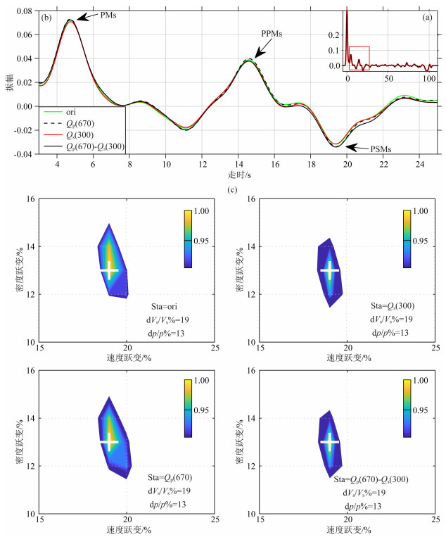 为了测试Q值影响,我们针对四个模型进行了数值实验,模型中地壳Q值如表 2所示(原文预设模型中地壳衰减系数为Qp=1340,Qs=600,δβ=19.2%,δρ=13.7%),根据IASP91模型并利用yaseis程序(Ma, 2013)计算得到各参数下的接收函数,并利用速度-密度跃变(δβ-δρ)扫描叠加方法计算不同模型中的速度和密度跃变.图 10b显示不同Q值模型,接收函数一次波和多次波幅度存在一定差异,但是速度-密度跃变扫描叠加方法得到的结果中(图 10c),速度和密度跃变基本与预设模型一致(如表 2所示).主要原因为当Qp或Qs改变时,接收函数一次波与多次波幅度同时发生变化,因此对速度和密度跃变扫描叠加结果不产生明显影响.