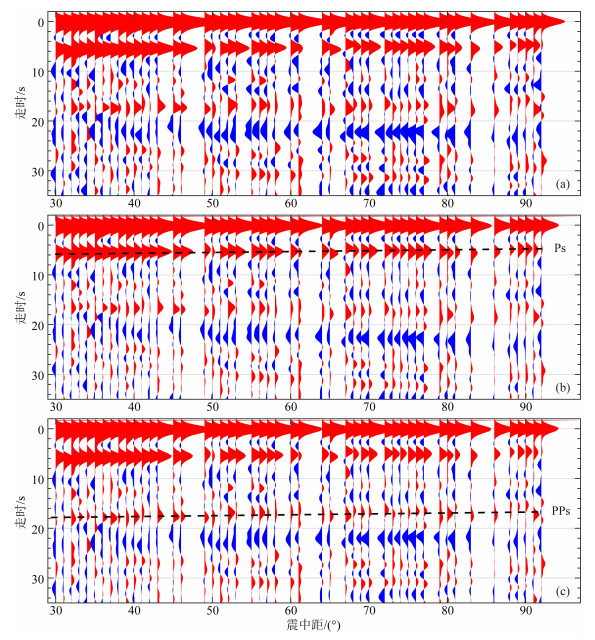 图 3 台站61035下方的接收函数 (a)接收函数震中距校正前叠加结果;(b)接收函数对Ps震相进行震中距校正后叠加结果;(c)接收函数对PPs震相进行震中距校正后叠加结果. Fig. 3 Receiver functions from the station 61035 (a) Receiver functions stacks before the epicentral distance correction; (b) Receiver functions stacks after the epicentral distance correction according to the Ps phase; (c) Receiver functions stacks after the epicentral distance correction according to the PPs phase. |