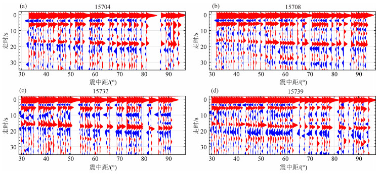 由于不同接收函数对应的震中距和震源深度不同,对应的P波射线参数p也不相同,导致P-S转换波的走时发生变化,因此需要根据震中距和震源深度对接收函数到时进行校正.在利用接收函数研究深部结构时,主要会用到Ps转换波、PPs和PSs多次波,为了突出不同震相,会针对不同震相的不同射线参数的接收函数进行校正.如图 3所示,其中图 3a显示了未经过校正的不同震中距接收函数叠加,图 3b显示了针对Ps震相进行的校正叠加,图 3c显示了针对PPs震相进行的校正叠加.以Ps校正为例,参考IASP91模型(Kennett and Engdahl, 1991)计算得到的不同深度Pds(d代表位于d km深度的间断面)震相到时,将所有接收函数校正到65°震中距,将30°~95°震中距的接收函数均匀分配到66个震中距单元内,将每个单元内校正后的接收函数进行叠加,经过叠加后Pds震相得到加强,图 4为15704、15708、15732和15739四个台站下方接收函数对Ps震相经过震中距校正后叠加的结果.
