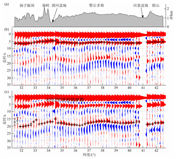 为探测横跨鄂尔多斯地块南北向上地壳结构的显著特征,我们根据Pms震相(假定Moho深度为35 km)的透射转换点位置(如图 1所示),将31°N—43°N的剖面均分为60个单元格.将每个单元内的所有接收函数根据透射转换点进行叠加,图 5b和图 5c分别显示了沿着整个剖面对Ps和PPs震相进行震中距校正后叠加的接收函数.