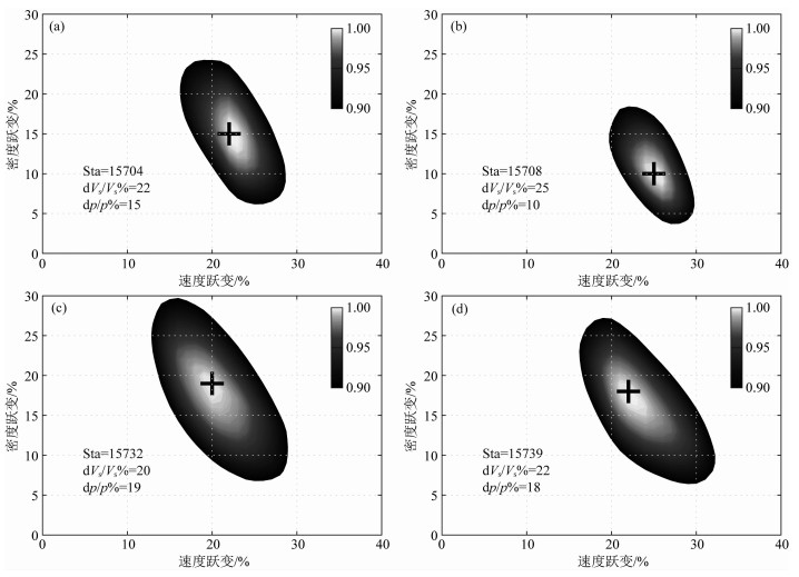 A1、A2和A3分别为震相Ps、PpPs和PpSs+PsPs的幅度,ωi为权重因子(ω1+ω2+ω3=1), 当misfit(δβ, δρ)最小时,对应的速度跃变δβ和密度跃变δρ为最优解(∂β=(β2-β1)/β1,∂ρ=(ρ2-ρ1)/ρ1,下标1(2)表示界面上(下)层),15704、15708、15732和15739台站下方的Moho面速度和密度跃变扫描结果如图 6所示.本文主要利用Ps、PpPs和PpSs+PsPs三种震相(至少保证有两个非常清晰的震相)的幅度来对速度和密度跃变进行约束,因此需要挑选一次波与多次波都比较清晰的台站进行计算,表 1显示了符合条件台站的计算结果.