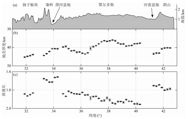 可以看到,在扬子板块和秦岭—渭河盆地之间的Moho面有一个明显的抬升,在地壳构造边界附近的地壳厚度有显著的变化.从扬子板块北缘到渭河盆地,地壳厚度为40.8~45.6 km,变化幅度相对较大,其中从秦岭到渭河盆地有明显的抬升,秦岭下方地壳厚度为43.2±0.9 km,而渭河盆地地壳减薄至40.8±0.3 km.鄂尔多斯南部地壳厚度向北逐渐增厚,变化相对比较平稳,而在36.5°N附近有明显的下凹.鄂尔多斯中部地壳厚度向北逐渐减薄,在38°N处存在极值(36 km)之后逐渐增厚,并且Moho面在北缘与河套盆地相邻处轻微抬升.河套盆地—阴山造山带地壳厚度为40.2~43.4 km,存在自南向北抬升的趋势,总体上变化平缓,相比鄂尔多斯北缘地壳增厚约3 km.