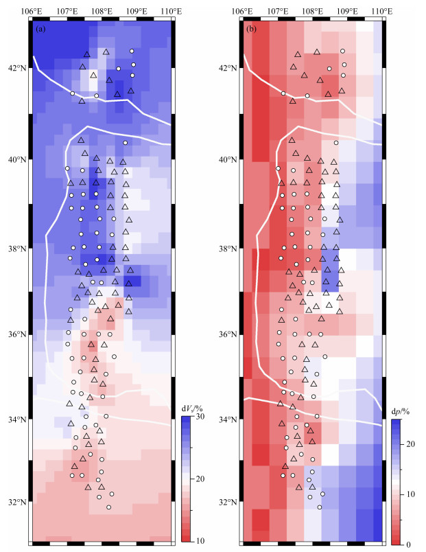 图 8 研究区的(a)速度跃变与(b)密度跃变结果 三角形为用于计算速度和密度跃变的台站;白色圆圈为无法用于计算速度和密度跃变的台站;白色线为块体边界. Fig. 8 (a) S-wave velocity contrasts and (b) density contrasts in the study The triangles are the stations used to calculate the velocity and density contrasts; The white circles are the stations that cannot be used to calculate the velocity and density contrasts; The white lines represent boundary of blocks. |