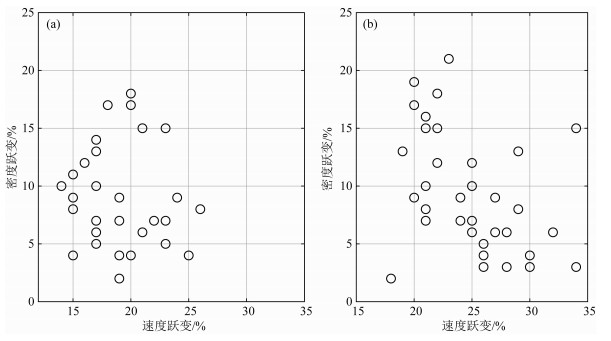图 9 速度与密度跃变关系图 (a)台站位置小于37°N;(b)台站位置大于37°N. Fig. 9 Relationship between S-wave velocity and density contrasts (a) For the stations with latitude less than 37°N; (b) For the stations with latitude larger than 37°N. |
