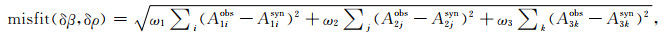 由于不同台站的仪器响应、数据质量及布设条件不同,导致不同台站下接收函数幅度影响因素各不相同,为了提高接收函数幅度提取的准确性,选取一次波与多次波都清晰稳定的台站,对单个台站进行幅度的叠加搜索.根据速度-密度跃变(δβ-δρ)扫描叠加方法,在δβ(0~40%)和δρ(0~30%)组成的空间进行搜索,搜索步长为1%,不同震中距的振幅观测值(Aobs)和理论值(Asyn)之间的差别,用misfit(δβ, δρ)表示: