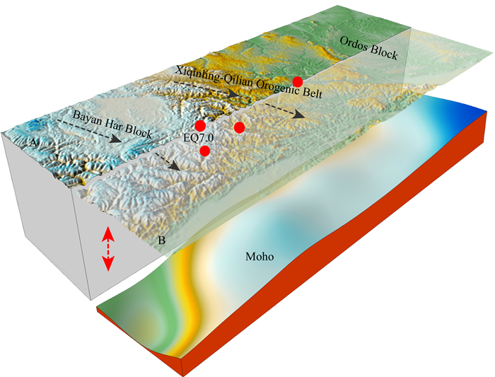 2.3 巴颜喀拉块体东部及邻区构造演化特征上述研究表明,巴颜喀拉块体东部是中国中部重力梯度带的边界区,也是均衡重力异常及岩石圈有效弹性厚度均显示其为整个研究区域内的低值区,且该低值区与本区域内强地震活动高度重合,主要是因为在印度板块与欧亚板块的碰撞的大背景下,巨大外力推动使各块体之间相互作用和运动,巴颜喀拉块体东部处于密度差异极大(重力梯度带)的边界带,与岩石圈结构较为完整的四川盆地、鄂尔多斯块体邻接(刚性阻挡),其块体内部存在的低密度、低速度层和断裂构造使其岩石圈强度降低,造成地壳垂向增生,使莫霍面向深部弯曲,同时地表向上抬升,同时地壳物质向东部流动,即挤压增生与横向流动同时发生(图 9),造成该区域与地震高度重合的重力均衡异常高值和走滑型断裂构造的密集发育.这也是造成本区域有效弹性厚度、大地热流值较低的主要原因.