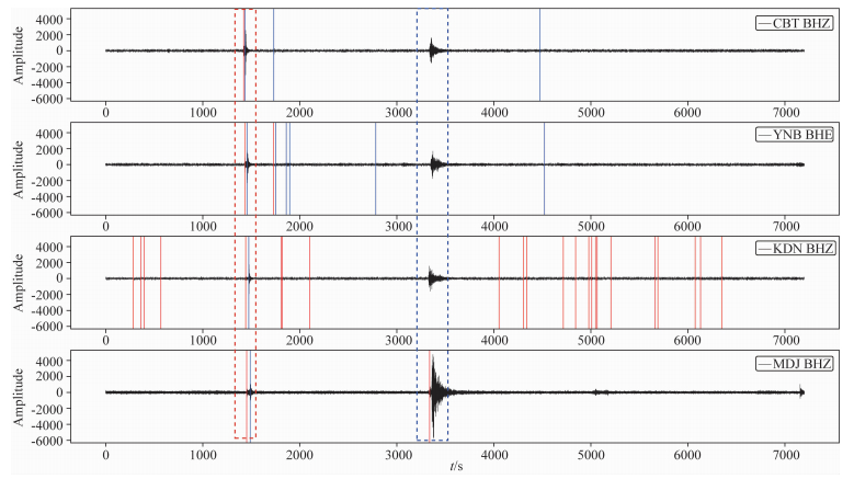 图 13 2018年8月5日11 : 00—13 : 00 CBT、YNB、KDN和MDJ台站数据处理情况图中包含了NDC观测报告中的一个事件,发震时间为20180805 11 : 23 : 21.事件在台站记录的震相用红色虚线框标出,蓝色虚线框标出了台站记录的远震信号. Fig. 13 Phase picking of stations CBT, YNB, KDN and MDJ at 11 : 00—13 : 00, August 5, 2018 There is one real event occurred during this period in NDC bulletin. The origin time of event is 20180805 11 : 23 : 21. The phases of events recoded at stations are marked with a red dashed box. The blue dashed box marks the a teleseismic phase recorded by stations. |