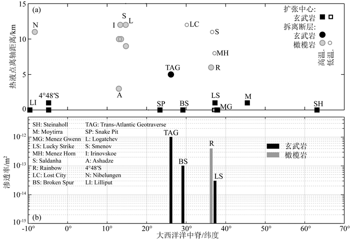 图 1 大西洋洋中脊热液活动分布规律(a)和部分热液区下伏洋壳渗透率测算(b) 热液区的位置引自Ernst et al., 2000; Zhao et al., 2012; Wheeler et al., 2013; Lalou et al., 1990; Charlou et al., 2000; Pedersen et al., 2010; Langmuir et al., 1997; Escartín et al., 2017; Dias et al., 2011; Fouquet et al., 2008; German et al., 2010; Kelley et al., 2005; Melchert et al., 2008; Murton et al., 1995; Haase et al., 2009, 渗透率测算结果引自Lowell et al., 2013. Fig. 1 Axial distribution of the hydrothermal fields of Mid-Atlantic Ridge (a) and their crustal permeability (b) The location of hydrothermal fields are from Ernst et al., 2000; Zhao et al., 2012; Wheeler et al., 2013; Lalou et al., 1990; Charlou et al., 2000; Pedersen et al., 2010; Langmuir et al., 1997; Escartiín et al., 2017; Dias et al., 2011; Fouquet et al., 2008; German et al., 2010; Kelley et al., 2005; Melchert et al., 2008; Murton et al., 1995; Haase et al., 2009, and the permeabilities are from Lowell et al., 2013. |